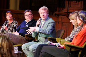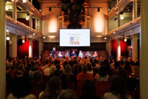 Foto: het panelgesprek met Wilma verhoeven, Mathijs Suidman, David Rozema, Roos Breeuwer en Loes Janssen (© Bas van Hattum).